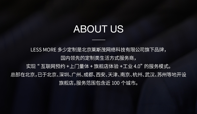 LESS MORE多少定制 2015年5月創(chuàng)立于北京,以互聯網思維和工業(yè)4.0切入服裝定制領域,獨創(chuàng)“互聯網預約+旗艦店體驗+免費上門量體+工業(yè)4.0 C2M生產”的模式,現已成為國內服裝定制行業(yè)的標桿品牌。